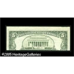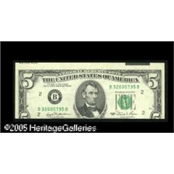 <B>Fr. 1976-B $5 1981 Federal Reserve Note. Extremely Fine.</B></I> This miscut $5 predates the sale of $5 FRN sheets to the general public, with this example showing a sheet number on each side. Lot:15379