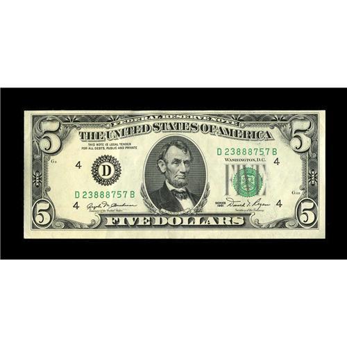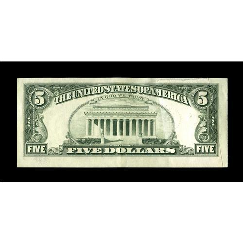 <B>Fr. 1976-D $5 1981 Federal Reserve Note. About Uncirculated.</B></I><BR>This wonderful note has a retained obstruction which looks like some BEP paper, but there is adherence as it will not move from the surface. All errors of this type are scarce and desirable. A soft center fold is all the circulation this note has encountered.<BR><BR><b>Shipping:</b> Coin/Currency (<a target="_blank" href="http://www.heritageauctions.com/common/shipping.php">view shipping information</a>)