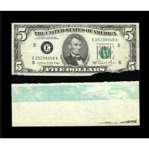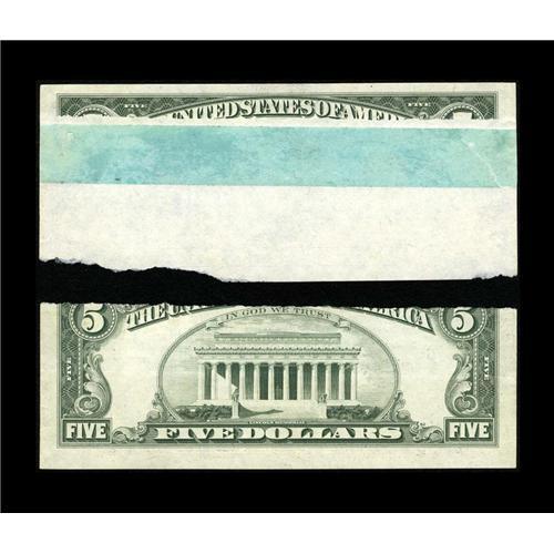 <B>Fr. 1977-E $5 1981A Federal Reserve Note. Choice Crisp Uncirculated.</B></I><BR>This is a failed splice error and it is possibly unique due to two pieces of paper stock comprising the error. This error consists of two separate pieces of paper money stock that was at one time held together by a strip of a blue-green adhesive which was applied at the Crane & Co. paper factory. The adhesive was designed to bond the end of one roll with the beginning of another roll. This time the splice got pass the inspector's watch-eye and the bonding would later fail. In April 2006 we sold a less dramatic splice error for over $5000. This example should easily surpass that.<BR><BR><b>Shipping:</b> Coin/Currency (<a target="_blank" href="http://www.heritageauctions.com/common/shipping.php">view shipping information</a>)