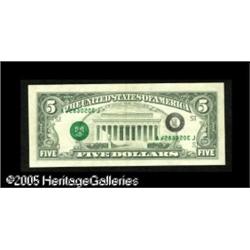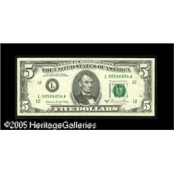 <B>Fr. 1977-L $5 1981A Federal Reserve Note. Extremely Fine.</B></I><BR>The third print, both green and black, is boldly offset onto the back. Lot:15326