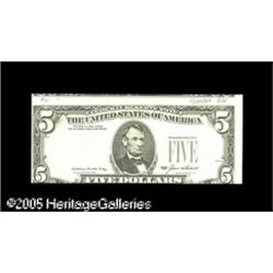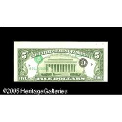 <B>Fr. 1978-D $5 1985 Federal Reserve Note. Choice Crisp Uncirculated.</B></I> A double error with the cut shifted upward towards the right, resulting in a portion of the note above being in evidence. The third printing is also inverted on the reverse. Lightly penned notations appear in the top margin on the face. The impression of the seal and serials is unusually robust. Lot:15380