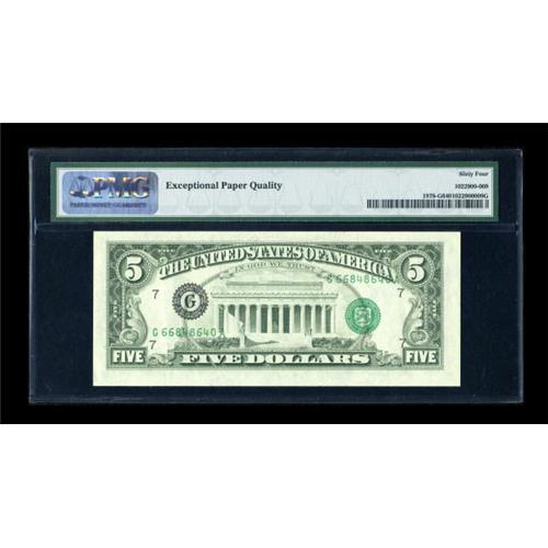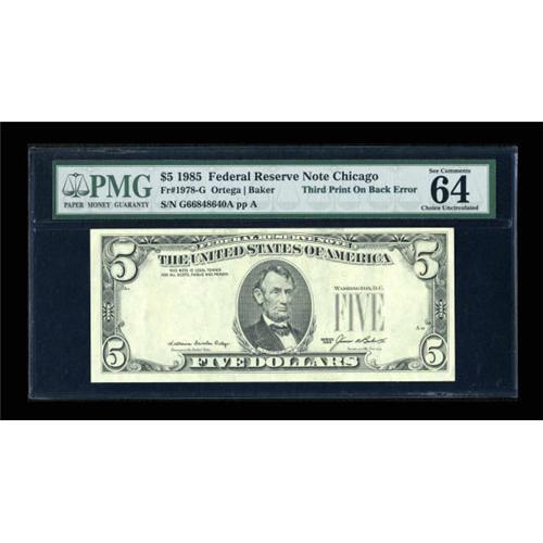 <B>Fr. 1978-G $5 1985 Federal Reserve Note. PMG Choice Uncirculated 64 EPQ.</B></I><BR> This is a fresh example of this always popular third print on back error. Plenty of embossing is seen through to the face of the note.<BR><BR><b>Shipping:</b> Coins & Currency (<a target="_blank" href="http://www.heritageauctions.com/common/shipping.php">view shipping information</a>)