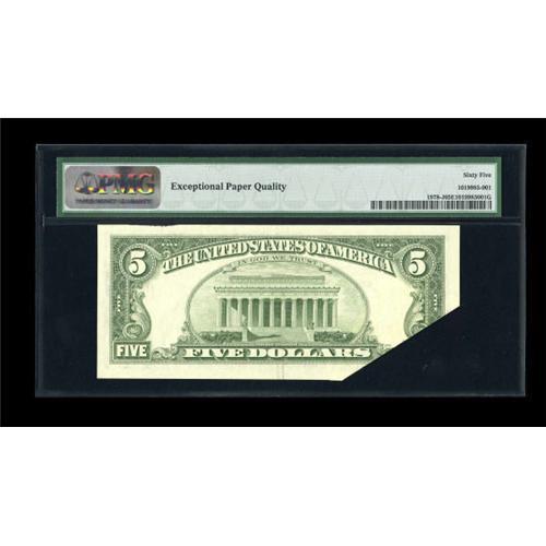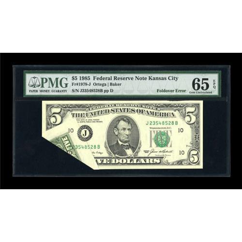 <B>Fr. 1978-J $5 1985 Federal Reserve Note. PMG Gem Uncirculated 65 EPQ.</B></I><BR> This striking foldover on a Kansas City FRN remains very bright with nice margins.<BR><BR><b>Shipping:</b> Coins & Currency (<a target="_blank" href="http://www.heritageauctions.com/common/shipping.php">view shipping information</a>)