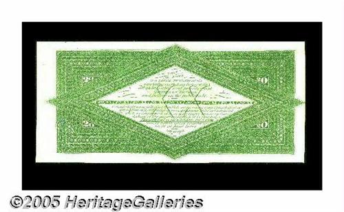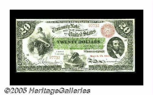 <B>Fr. 197a $20 1863 Interest Bearing Note Choice Extremely Fine.</B></I> At the our Taylor Sale three months ago, we had an absolutely identical piece with the following description. "CAA has had pleasure of offering this absolutely gorgeous note once before. It was lot 1381 of our January 2001 FUN sale where it was described "The consecutive serial number to the magnificent example we sold in May 1997, and virtually identical as well. Only three high-grade examples of this Friedberg number exist in high grade; of the roughly two dozen pieces known, the majority are low grade and/or restored. This note gives the appearance of an absolute Gem, with good margins, perfect color, razor-sharp printing, and all the eye appeal in the world. It has three extremely light, natural folds that can be seen only when the note is examined at an angle to the light. Middle-of-the-book notes, Interest Bearing and Compound Interest Bearing alike, don't hold the interest of most collectors, as they are all almost invariably low grade, and lack eye appeal. This spectacular, unmolested piece will grab and hold the attention of the most jaded collector. It's a "Wonder Note" that deserves a place in the very finest of collections." In that mention of "only three high grade examples", this one was the third piece. The two consecutive notes mentioned above and this note are identical in every way and beyond that, the grade for the remaining twenty-three known notes rolls right of the table. We estimated our Taylor example at $35,000 and it charged right past that number, ultimately realizing $63,250. We would anticipate tonight's realization to be just about the same.