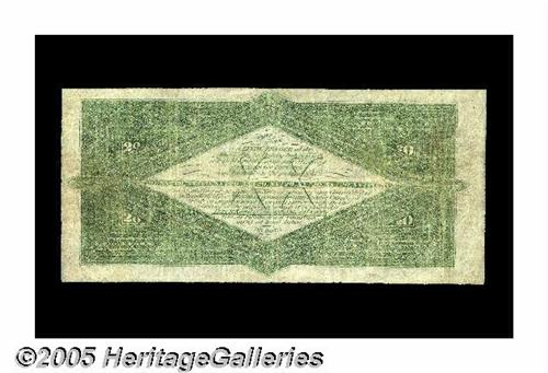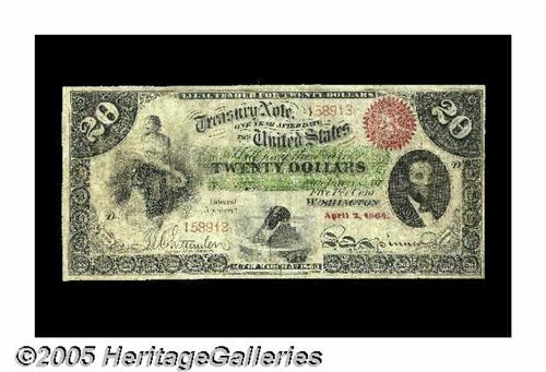 <B>Fr. 197a $20 1863 Interest Bearing Note Fine.</B></I> About two dozen examples of this number are known and not a single one of them grades as high as About Uncirculated. One of the two finest known pieces, a Choice XF in our Taylor Family Sale from February of this year, realized $63,250 on an estimate of $35,000-up. While that gorgeous note was heads-and-shoulders above this piece, this note is well margined with excellent eye appeal for its rather low, technical grade. It has a few, very minor extraordinarily well done restorations at the edges, but they do not affect the eye appeal, and should not impact the value. This is a piece that will allow a budget-conscious collector to obtain a virtually unattainable design type.