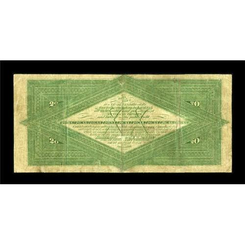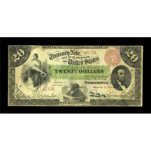 <B>Fr. 197a $20 1863 Interest Bearing Note Fine-Very Fine.</B></I> This Interest Bearing Note first appeared in our 2005 FUN Signature Auction as part of the Malcolm Trask Collection, where the description stated, "Free of major restorations" and went on to mention, "a number of short edge splits, three of which are checked with transparent tape." That description ended by mentioning, "The note could be much improved with a little proper modern care." The buyer employed the assistance of a professional, who carefully and painstakingly provided the care this piece so desperately needed. While the grade remains the same, the previously unsightly edge splits are virtually invisible, the tape is gone and the overall appearance is much improved. The note has an illustrious pedigree, including both Malcolm Trask and Grinnell. <BR><BR><BR><b>Shipping:</b> Coins & Currency (<a target="_blank" href="http://www.heritageauctions.com/common/shipping.php">view shipping information</a>)
