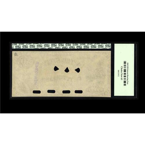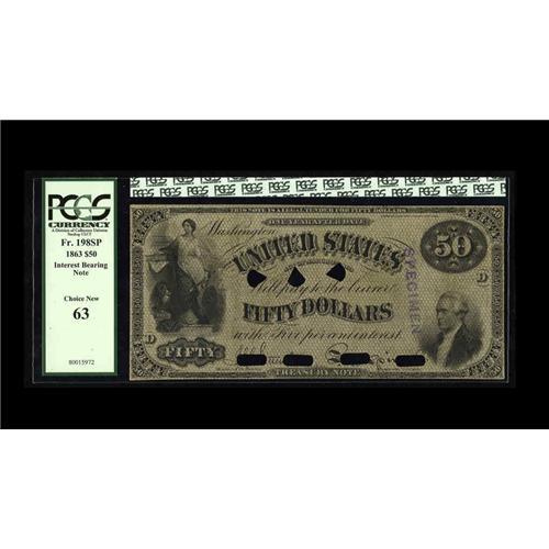 <B>Fr. 198 $50 1863 Interest Bearing Face Proof PCGS Choice New 63.</B></I> This is a plate letter D proof impression of the face of this rare issue that bears an elaborate latticework olive-green overprint and is also stamped "SPECIMEN" at right. Only three fully issued examples of this number are documented, making this proof that much more desirable. There are four oblong punch-out cancels through the Treasury signatures, plus three pie-slice shaped cancellations at center. In <I>U.S. Essay, Proof and Specimen Notes</B></I> by Gene Hessler there is not a description of a proof of this design with a full overprint. As with almost all Federal proofs, this note is excessively rare and undervalued, and a great opportunity for the astute collector.