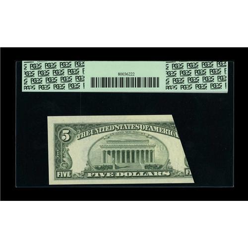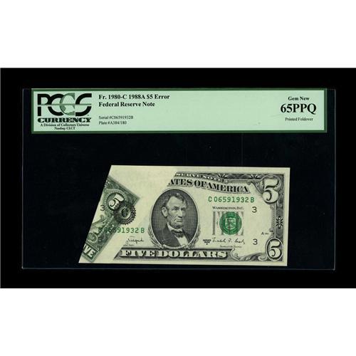 <B>Fr. 1980-C $5 1988A Federal Reserve Note. PCGS Gem New 65PPQ.</B></I><BR>This is a neat foldover that shows much of the top selvage that has been cut down. The original surfaces are clearly seen beneath the holder.<BR><BR><b>Shipping:</b> Coin/Currency (<a target="_blank" href="http://www.heritageauctions.com/common/shipping.php">view shipping information</a>)