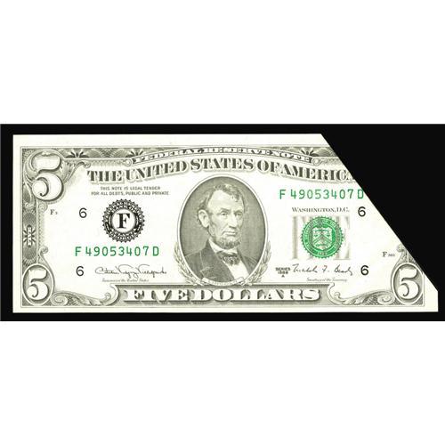 <B>Fr. 1980-F $5 1988A Federal Reserve Note. Choice About Uncirculated.</B></I> This note displays a most distinctive folding and cutting error, which has left a large portion of the note above attached to this note.