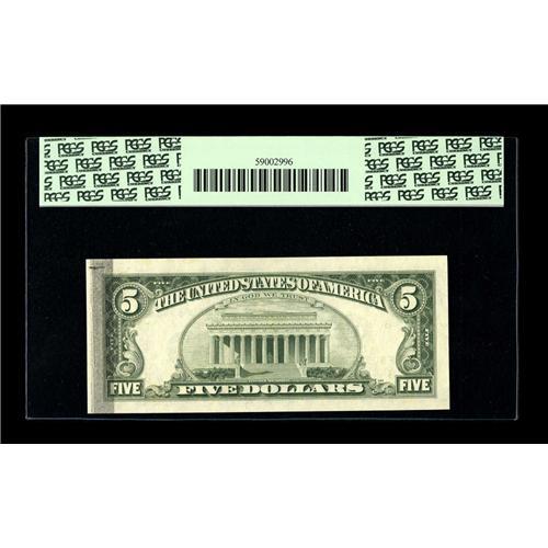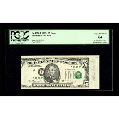 <B>Fr. 1980-F $5 1988A Federal Reserve Note. PCGS Very Choice New 64.</B></I><BR>The face printing is majorly shifted as the sheet was skewed for the application of the second print. Also the back has a nifty roller ink mark that looks quite similar to an end of roll marking. A neat error that would make an excellent addition to a specialized collection.<BR><BR><b>Shipping:</b> Coin/Currency (<a target="_blank" href="http://www.heritageauctions.com/common/shipping.php">view shipping information</a>)