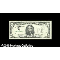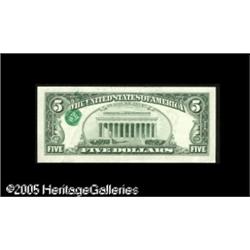 <B>Fr. 1980-G $5 1988A Federal Reserve Note. Gem New.</B></I><BR>This interesting $5 has a standard foldover error on its right end causing the seal and a good portion of the serial number to print on the back. The left side of the note is an obstruction error where a portion of the district seal was blocked from printing. Lot:15282