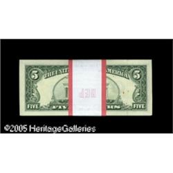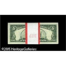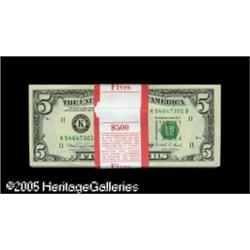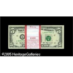 <B>Fr. 1980-K $5 1988A Federal Reserve Notes. Original Pack of 100. Gem Crisp Uncirculated.</B></I><BR><B>Fr. 1983-L $5 1993 Federal Reserve Notes. Original Pack of 100. Gem Crisp Uncirculated.</B></I><BR>Full margins corral the Dallas pack, with a BEP band that shows a scuff spot. Also, a couple of small red ink dots are found on the last note in the San Fran pack.<BR> 200 notes Lot:15969