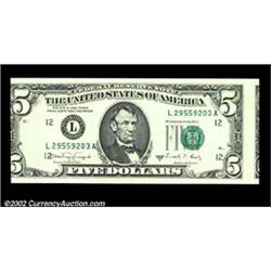 Fr. 1980-L $5 1988A Federal Reserve Note. Choice Crisp Uncirculated. A shifted third printing has ca