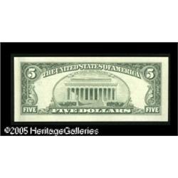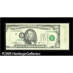 <B>Fr. 1980-L $5 1988A Federal Reserve Note. Crisp Uncirculated.</B></I> A shifted third printing goes hand-in-hand with the miscut on this $5 that possesses a large amount of right-hand selvage. Lot:15248