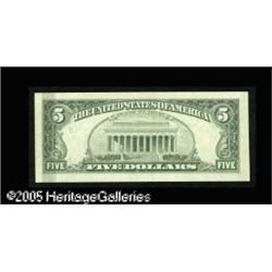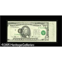 <B>Fr. 1980E $5 1988A Federal Reserve Note Choice About New.</B></I> A truly neat error with a normal back printing and normal third printing, but with the first face printing shifted far to the left causing the serial number and district seal to enter the portrait area and leaving an inch of blank paper at the right. Lot:15381