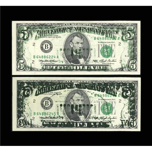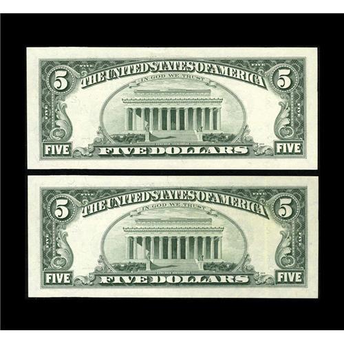 <B>Fr. 1982-B $5 1993 Federal Reserve Notes. Two examples Choice About Uncirculated.</B></I><BR>A pair of interesting partial back to face offsets which are 21 notes apart. One is dark, the other a bit lighter. A light center fold is seen on each note.