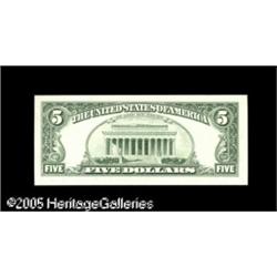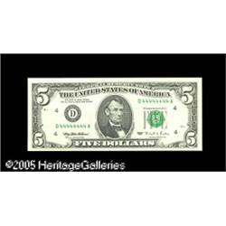 <B>Fr. 1984-D $5 1995 Federal Reserve Note. Gem Crisp Uncirculated.</B></I><BR>A pack fresh Gem with the enhancement of solid serial D44444444A. Lot:15972