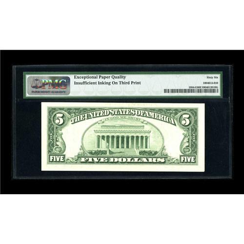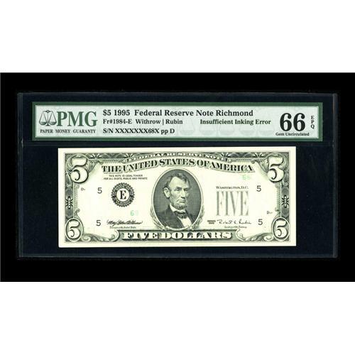 <B>Fr. 1984-E $5 1995 Federal Reserve Note. PMG Gem Uncirculated 66 EPQ.</B></I><BR>This is an eye catching mistake with only "68" visible in both serial numbers of the green overprint.<BR><BR><b>Shipping:</b> Coins & Currency (<a target="_blank" href="http://www.heritageauctions.com/common/shipping.php">view shipping information</a>)