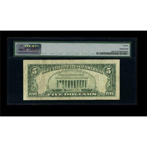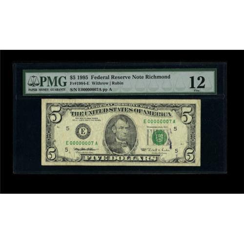 <B>Fr. 1984-E $5 1995 Federal Reserve Note. Serial Number 12. PMG Fine 12.</B></I><BR> A well circulated Serial Number 7 note. It is amazing that this note spent so much time circulating before a collector or very observant person snatched this piece from the jaws of destruction. One more trip to a bank and the wear would have likely earned it a trip back to the BEP for destruction.<BR><BR><b>Shipping:</b> Coins & Currency (<a target="_blank" href="http://www.heritageauctions.com/common/shipping.php">view shipping information</a>)