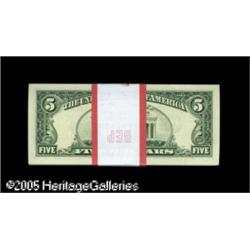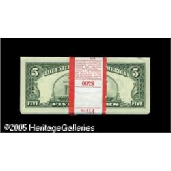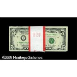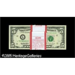 <B>Fr. 1984-F $5 1995 Federal Reserve Notes. Original Pack of 100. Gem Crisp Uncirculated.</B></I><BR><B>Fr. 1985-L $5 1995 Federal Reserve Notes. Original Pack of 100. Gem Crisp Uncirculated.</B></I><BR>Only the first and last notes of the Atlanta pack show handling. Also, the last note in this pack is a 1993 San Fran $5 to replace the original eleventh note in the pack. However, bank personnel did not wreak their havoc upon the pristine San Fran pack in this lot.<BR> 200 notes Lot:15974