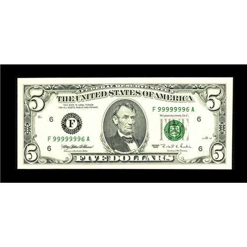<B>Fr. 1985-F $5 1995 Federal Reserve Note. Gem Crisp Uncirculated.</B></I><BR>A touch of handling is noted, but hardly grade limiting. More importantly, the note is three notes from a solid serial number.<BR><BR><b>Shipping:</b> Coin/Currency (<a target="_blank" href="http://www.heritageauctions.com/common/shipping.php">view shipping information</a>)