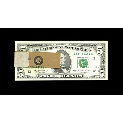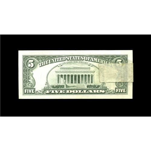 <B>Fr. 1985-L $5 1995 Federal Reserve Note. About Uncirculated.</B></I> A great error with the third printing being applied over a piece of taped kraft paper, with the tape holding the kraft paper in place stretching around to the back of the note. These dramatic errors have proved extremely popular, with auction records reaching very close to the five figure mark. Expect to see bidding easily reach and perhaps exceed...