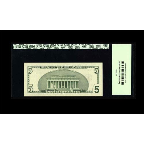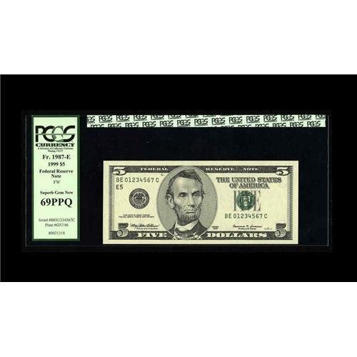 <B>Fr. 1987-E $5 1999 Federal Reserve Note. PCGS Superb Gem New 69PPQ.</B></I><BR>We have already seen PCGS 69PPQ graded notes command premiums. This unadulterated and perfectly printed $5 features a most appealing serial number to boot, BE01234567C.<BR><I>From the Scottsdale Collection</B></I>