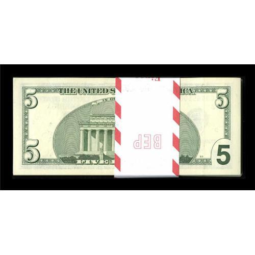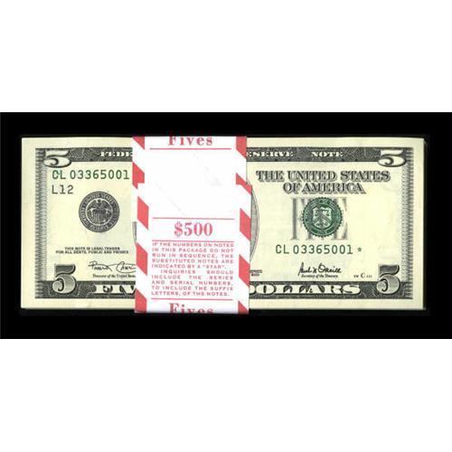 <B>Fr. 1988-L* $5 2001 Federal Reserve Notes. Original Pack of 100. Gem Crisp Uncirculated.</B></I><BR> A pleasing group with ample margins all the way through the pack.<BR><BR><b>Shipping:</b> Coins & Currency (<a target="_blank" href="http://www.heritageauctions.com/common/shipping.php">view shipping information</a>)
