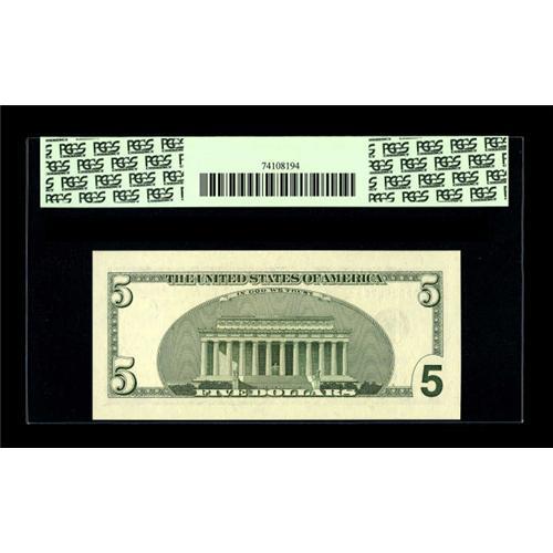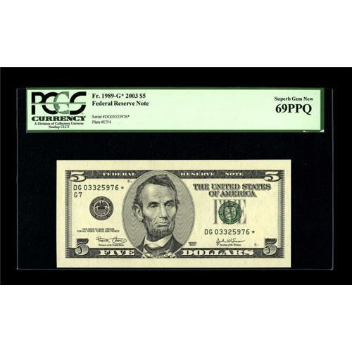 <B>Fr. 1989-G* $5 2003 Federal Reserve Note. PCGS Superb Gem New 69PPQ.</B></I><BR>A point from perfect with Jumbo margins.<BR><BR><b>Shipping:</b> Coin/Currency (<a target="_blank" href="http://www.heritageauctions.com/common/shipping.php">view shipping information</a>)
