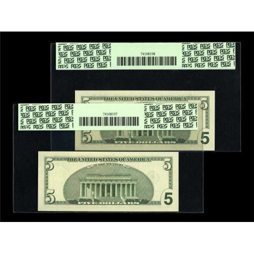 <B>Fr. 1989-G* $5 2003 Federal Reserve Notes. Two Examples. PCGS Superb Gem New 69PPQ</B></I>.<B></B></I><BR> A low print run of 320,000 ensures these spectacular, widely margined notes will remain elusive for years to come.<BR><BR><b>Shipping:</b> Coins & Currency (<a target="_blank" href="http://www.heritageauctions.com/common/shipping.php">view shipping information</a>)