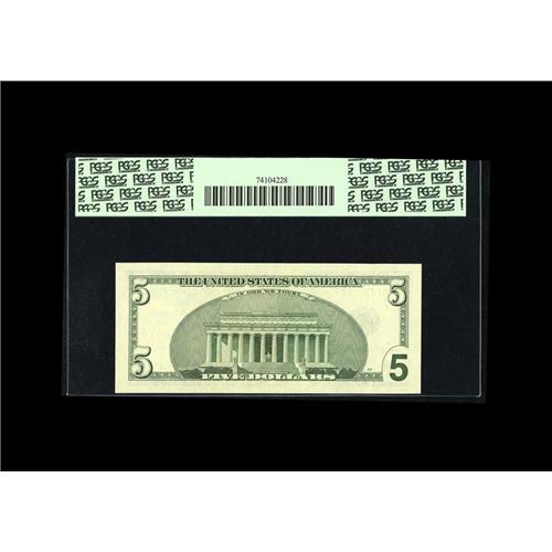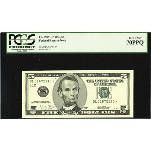 <B>Fr. 1989-L* $5 2003 Federal Reserve Note. PCGS Perfect New 70PPQ.</B></I><BR>A perfectly margined specimen that has phenomenal centering. On notes such as this an estimate for perfection is difficult. Figure it to be in the area of...
