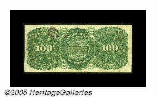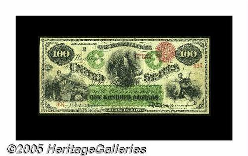 <B>Fr. 199 $100 1863 Interest Bearing Note Choice Very Fine.</B></I> Only three examples of this number are known, one of which is simply reported by grade and serial number and has never been seen on the market. The other two notes are virtually identical. The Taylor Family example was sold as lot 16752 in our sale of three months ago, and it more than doubled our estimate, realizing $126,500. We can not remember a previous situation where a rarity of this magnitude has appeared with such a short gap in time, but we are certain the gentleman who went home as the disappointed underbidder in February will be thrilled at this second opportunity. Both notes are utterly identical in grade, neither with any repair or restoration and both with ideal color. This note has a slight edge for two reasons. First, and most importantly, the centering is better. This piece has four full margins and the other example was quite close at the top left. Secondly, we've already sold the other one, and we're selling this one now, so of course it's better. Kidding aside, this is one magnificent piece of currency and it will very likely realize just about the same price as the Taylor piece.