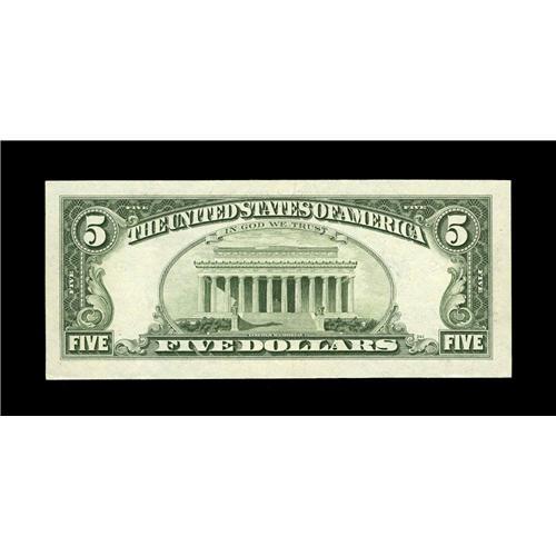 <B>Fr.19xx-I $5 19__ Federal Reserve Note. Gem Crisp Uncirculated.</B></I> This example totally missed the second printing. The embossing is pronounced and the back margins are huge.