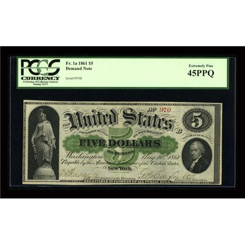 <B>Fr. 1a $5 1861"for the" Demand Note PCGS Extremely Fine 45PPQ.</B></I> The finest "for the" Demand note and, in our opinion, one of the most historic Large Sized rarities known. When Demand notes were first printed, the words "Register of the Treasury" and "Treasurer of the United States" were printed at the bottom of the note below the signature lines. The Treasury clerks, who were authorized to sign for these officials, added the words "for the" after their signatures. After a short while, it was realized that the words "for the" should be added to the plate in front of "Register of the Treasury" and "Treasurer of the United States" to save a considerable amount of time and effort on the part of the signers. Only eight examples of Fr. 1a are known to exist--this note and one other are EFs, the six others all grade Fine-Very Fine and lower. The last Friedberg 1a that we sold was in April 2006 where it was graded Fine-Very Fine. That piece realized $60,375 after spirited floor bidding. This note is worlds finer. It's a three-fold EF with excellent margins, perfect colors, bold hand signatures, and the "for the" in front of "Register" and "Treasurer" are dark, clean and clear. Even if this were a Fr. 1 (the printed variety with over 100 known), it would be in the top half-dozen known for grade. Old time collectors considered these "for the" Demand notes to be the pinnacle of Large Size currency collecting, and this note is the very best of the Type.<BR><BR><b>Shipping:</b> Coins & Currency (<a target="_blank" href="http://www.heritageauctions.com/common/shipping.php">view shipping information</a>)