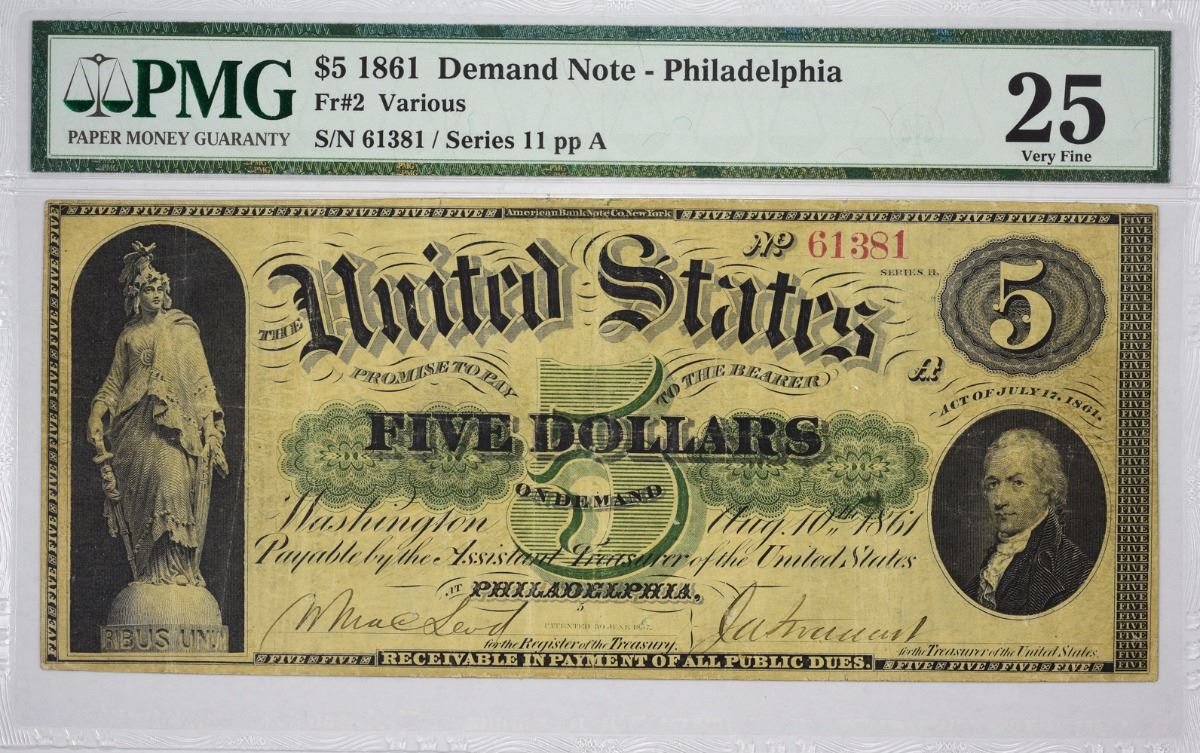 Fr. 2. 1861 $5 Demand Note. Philadelphia. PMG Very Fine 25.