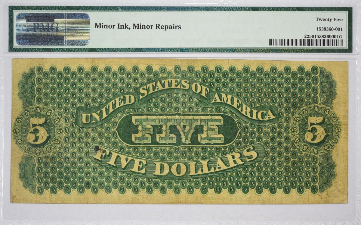 All Demand Notes are highly scarce and locating ones without large visual flaws, even more so. PMG does note, “Minor Ink, Minor Repairs,” in the comments although both are very subtle. The important “Green Back,” notes, as these are called got their name from the solid green color used on the nearly entirely printed reverse.