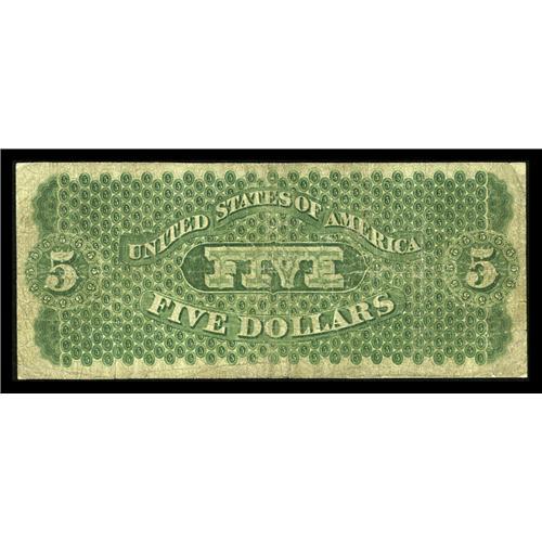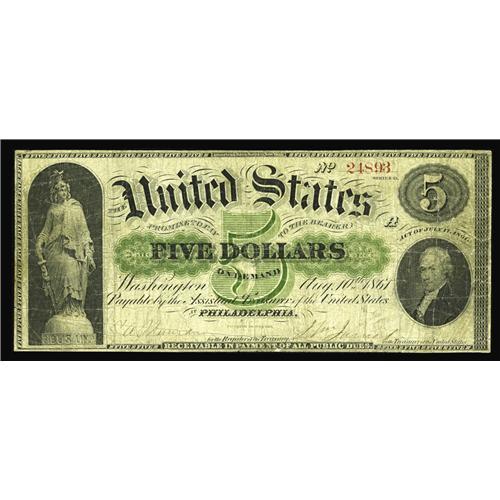 <B>Fr. 2 $5 1861 Demand Note Fine.</B></I> There is a very short edge tear at the left and a few pinholes, but the pen signatures are strong, and the colors as well as the margins are far above average for this very scarce and considerably undervalued Demand Note type.