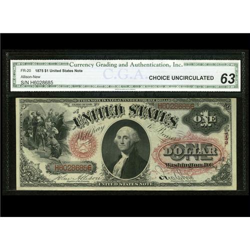 Fr. 20 $1 1875 Legal Tender CGA Choice Uncirculated 63. Fr. 20 $1 1875 Legal Tender CGA Choice Uncir