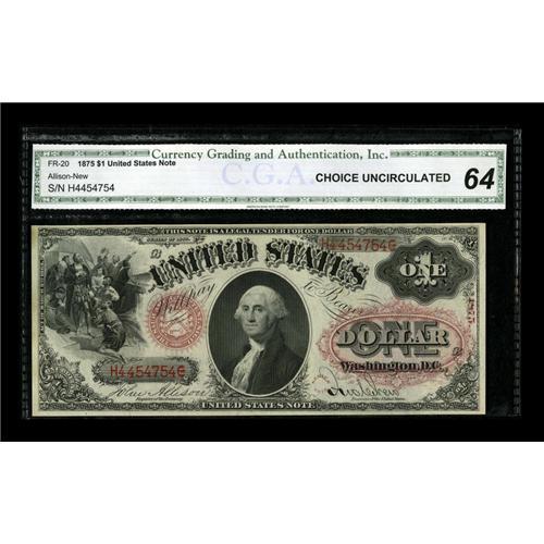 <B>Fr. 20 $1 1875 Legal Tender CGA Choice Uncirculated 64.</B></I> A handsome example of this early Ace that appears to us to have been graded quite accurately.<BR><BR><b>Shipping:</b> Coins & Currency (<a target="_blank" href="http://www.heritageauctions.com/common/shipping.php">view shipping information</a>)