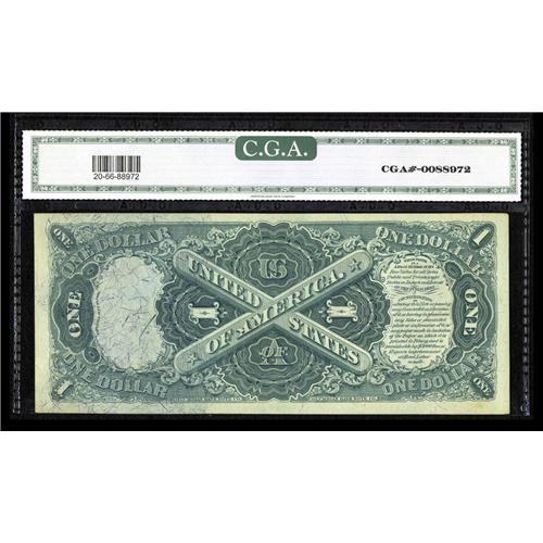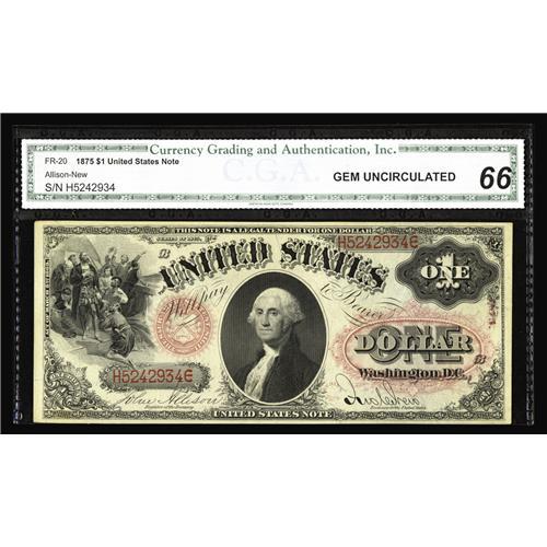 <B>Fr. 20 $1 1875 Legal Tender CGA Gem Uncirculated 66.</B></I> This certified example is a clear standout from the generally encountered level of eye appeal displayed by the typical uncirculated note bearing this Friedberg number. This is quite simply a note which merits strong accolades and is destined to reside in the holdings of a quality conscious collector when the hammer falls tonight.