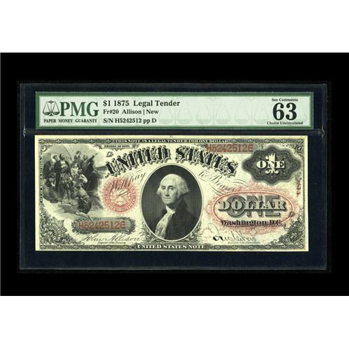 <B>Fr. 20 $1 1875 Legal Tender PMG Choice Uncirculated 63 EPQ.</B></I> The colors are super on this note that appears to be a Gem in every respect but for its bottom face margin, which is quite close all the way across.<BR><BR><b>Shipping:</b> Coin/Currency (<a target="_blank" href="http://www.heritageauctions.com/common/shipping.php">view shipping information</a>)