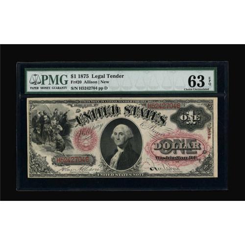 <B>Fr. 20 $1 1875 Legal Tender PMG Choice Uncirculated 63 EPQ.</B></I> A partial plate number is noted in the sizeable top margin. The paper is most pleasing and original.<BR><BR><b>Shipping:</b> Coins & Currency (<a target="_blank" href="http://www.heritageauctions.com/common/shipping.php">view shipping information</a>)