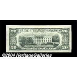 Fr. ? $20 ? Federal Reserve Note. Choice Crisp Uncirculated. A lovely example missing the entire first face printing. <BR><BR><B>Important notice:</B> Heritage usually auctions material at the rate of 200-250 lots per hour. On some occasions eBay Live bid software or the Internet may not be able to keep up with the pace of the auction. We recommend placing a realistic absentee bid now as insurance to avoid disappointment. Occasionally the auctioneer may eliminate or reject an eBay Live bid, and the auctioneer may also reopen a lot after the close of the eBay live bidding (usually because we missed an audience bid), and may reject your bid even if it shows you as the winning bidder. By bidding via eBay Live, you agree that Heritage may award the lot to another bidder at its sole discretion under the circumstances described above or any other reasonable circumstances. Since eBay bids are not shown to us until we open the lot on the floor, we treat those bids just like floor bids. In most cases the floor responds before the eBay bid is presented to us, due to Internet lag time, so for consistency we have made it a policy that floor bids are always considered first over tie eBay live bids. Also please note that all Heritage lots purchased through eBay Live carry a 20% Buyer's Premium. Please make sure you read the Terms and Conditions before you bid. <BR><BR><B>IMPORTANT ANNOUNCEMENT ABOUT RESERVES:</B> Heritage now divulges all reserves on its web site 7 days before every auction. If you want to know whether the reserve on this lot has been met, and if not, what the reserve amount is, please visit this lot page on the HeritageCoin.com web site, or email: bid@HeritageGalleries.com