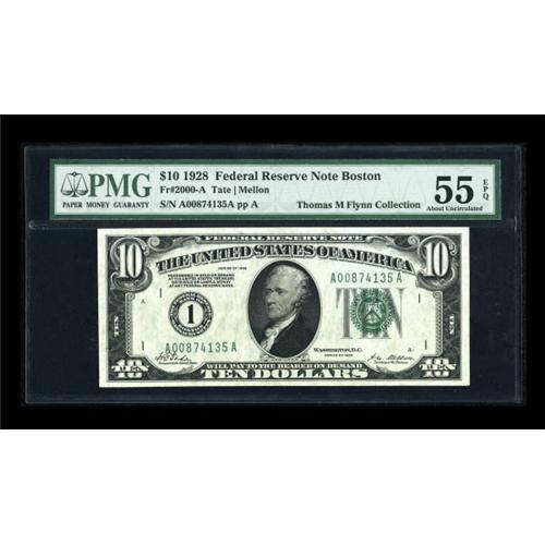 <B>Fr. 2000-A $10 1928 Federal Reserve Note. PMG About Uncirculated 55 EPQ.</B></I><BR> Boston is one of the scarcer districts in this series, with this piece very near the full uncirculated grade. <BR><I>From The Thomas M. Flynn Collection</B></I><BR><BR><b>Shipping:</b> Coins & Currency (<a target="_blank" href="http://www.heritageauctions.com/common/shipping.php">view shipping information</a>)