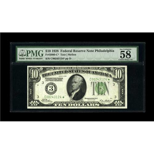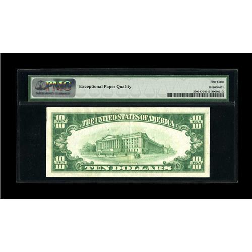 <B>Fr. 2000-C* $10 1928 Federal Reserve Note. PMG Choice About Unc 58.</B></I><BR>Series 1928 notes are often seen this boldly printed. The details are very dark, but not so dark as to lose any of the fine details. A center fold accounts for the grade.<BR><BR><b>Shipping:</b> Coin/Currency (<a target="_blank" href="http://www.heritageauctions.com/common/shipping.php">view shipping information</a>)