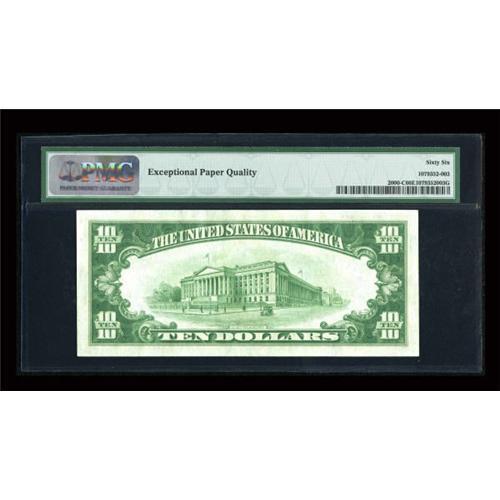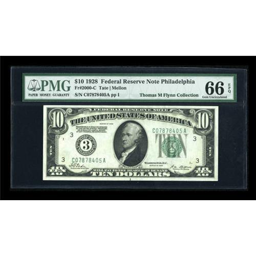 <B>Fr. 2000-C $10 1928 Federal Reserve Note. PMG Gem Uncirculated 66 EPQ.</B></I><BR> A lovely and well centered piece well deserving its exalted Gem 66 grade. <BR><I>From The Thomas M. Flynn Collection</B></I><BR><BR><b>Shipping:</b> Coins & Currency (<a target="_blank" href="http://www.heritageauctions.com/common/shipping.php">view shipping information</a>)