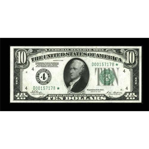 <B>Fr. 2000-D* $10 1928 Federal Reserve Note. Crisp Uncirculated.</B></I><BR> A wonderful replacement with bright paper held back from a higher grade due to a paper clip indent and a slight margin nick along the top.<BR><BR><b>Shipping:</b> Coins & Currency (<a target="_blank" href="http://www.heritageauctions.com/common/shipping.php">view shipping information</a>)