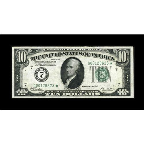 <B>Fr. 2000-G* $10 1928 Federal Reserve Note. Very Fine.</B></I><BR>Ample margins and dark inks are exhibited by this star.