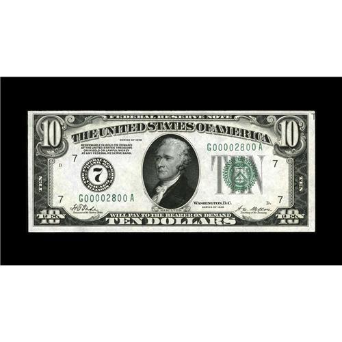 <B>Fr. 2000-G $10 1928 Federal Reserve Note with low #2800. Choice Crisp Uncirculated.</B></I><BR>A bright, fresh and crisp example of this very desirable numbered district note that has punch through embossing and excellent eye appeal. The observed low number in Oakes is G00001200A which makes this note appear even more desirable upon further reflection.<BR><BR><b>Shipping:</b> Coin/Currency (<a target="_blank" href="http://www.heritageauctions.com/common/shipping.php">view shipping information</a>)
