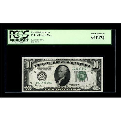 <B>Fr. 2000-I $10 1928 Federal Reserve Note. PCGS Very Choice New 64PPQ.</B></I><BR>Bold original embossing and crackling fresh paper are clearly visible through the holder. The Minneapolis district is really quite scarce for this numbered district issue and high grade examples are particularly difficult to locate. The new Schwartz value of $600 in CU could likely prove to be conservative before the hammer falls tonight.<BR><BR><b>Shipping:</b> Coins & Currency (<a target="_blank" href="http://www.heritageauctions.com/common/shipping.php">view shipping information</a>)
